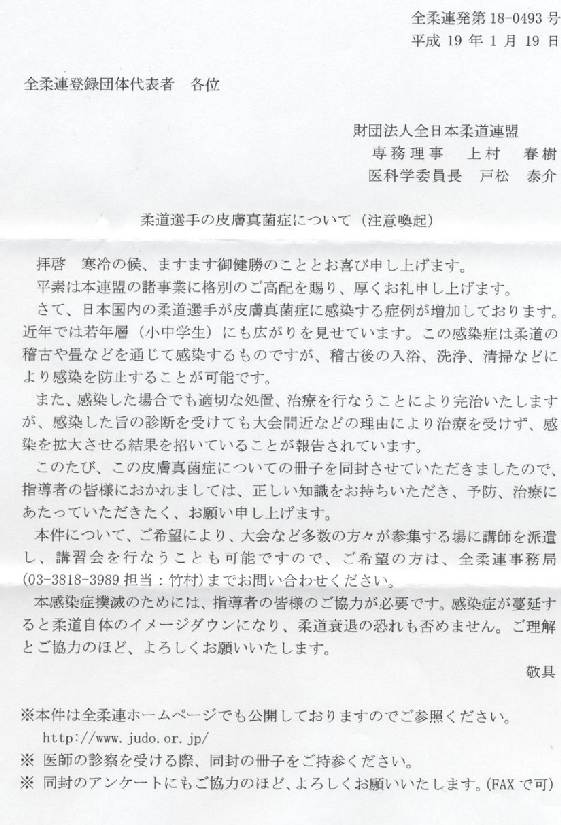 日本国内の柔道選手の皮膚真菌症に感染する症例増加しております。近年では小中学年にも広がり始めている。この感染は柔道の稽古や畳などを通じて感染するものですと・・発表しています。