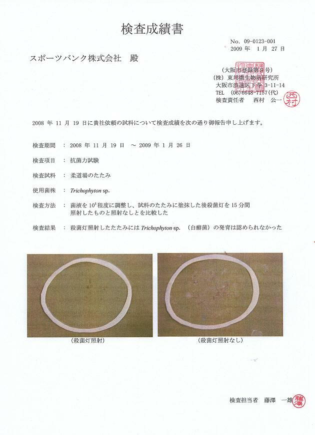 ◆検査方法・・菌液を10℃程度に調整し、試料のたたみに塗抹した後殺菌灯を15分間照射した
