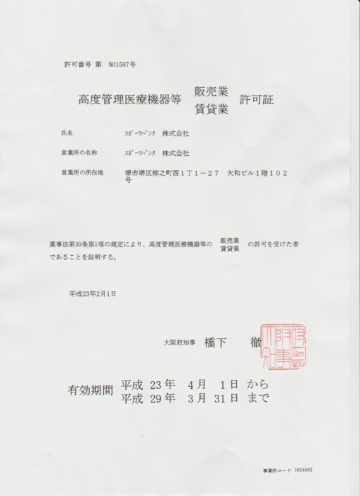 高度管理医療機器等販売業・賃貸業許可許可番号1587号