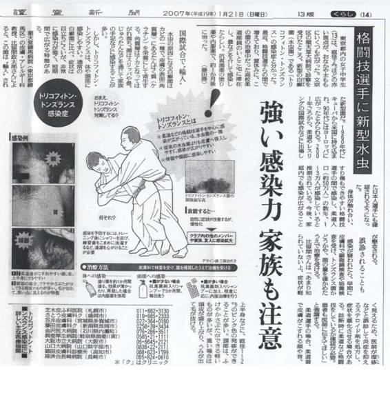 読売新聞閲覧。強い感染症、家族も注意。格闘技選手にも新型水虫。